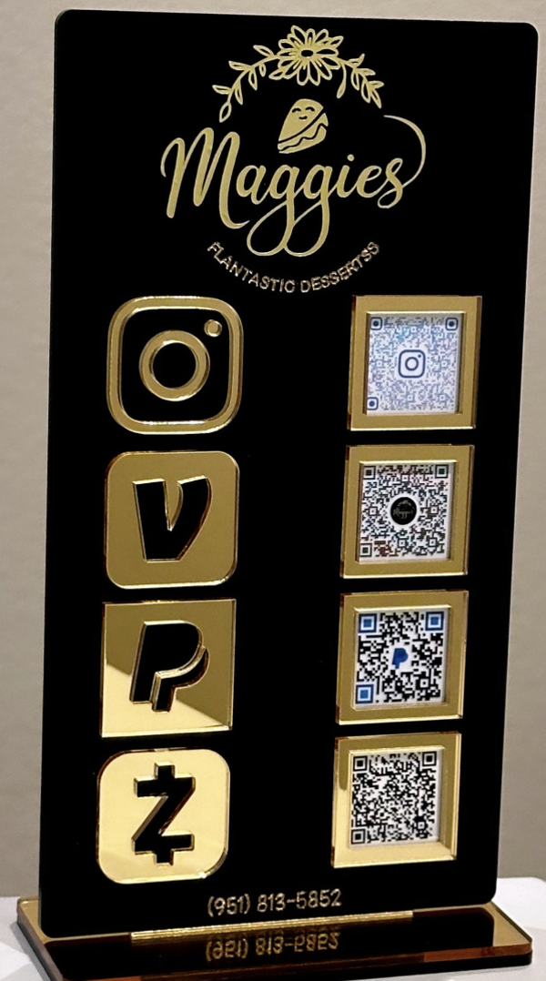 1. Business name, scan to pay, like & follow, scan to tip, scan to donate, etc. *** SOCIAL MEDIA TAGS/HANDLES UNDER QR CODES ARE UPON REQUEST ONLY. Otherwise, it will just be the social media/payment icons and your QR code.