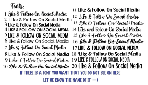 2. Font style (can do different styles, please specify which words you want for different font) Color will be in black or white unless request something else.